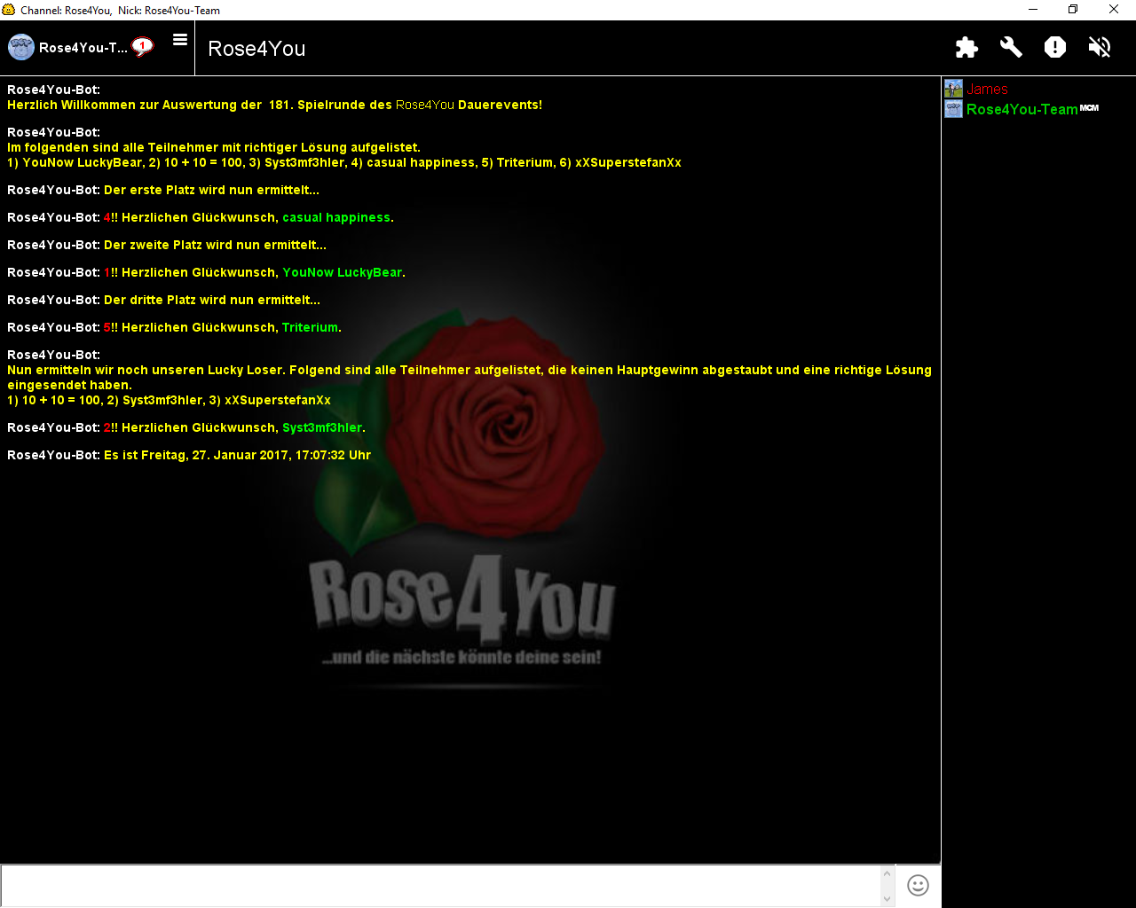Die Aufgabe #180 lief vom 03.01.2017 - 01:39:03 Uhr bis zum 08.01.2017 - 00:00:00 Uhr und hatte 5 Einsendungen.
