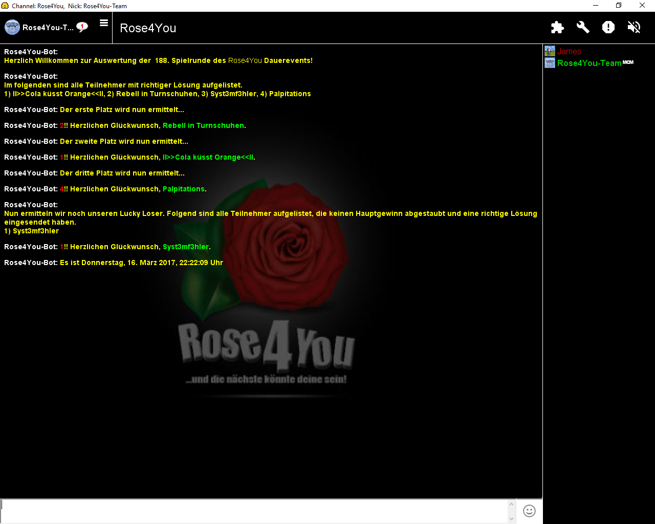 Die Aufgabe #188 lief vom 05.03.2017 - 21:19:56 Uhr bis zum 12.03.2017 - 00:00:00 Uhr und hatte 4 Einsendungen.
