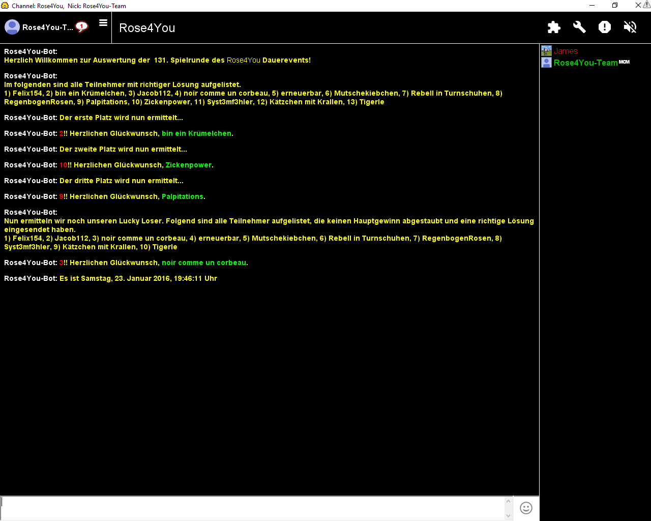 Die Aufgabe #131 lief vom 10.01.2016 - 22:07:47 Uhr bis zum 17.01.2016 - 00:00:00 Uhr und hatte 13 Einsendungen.