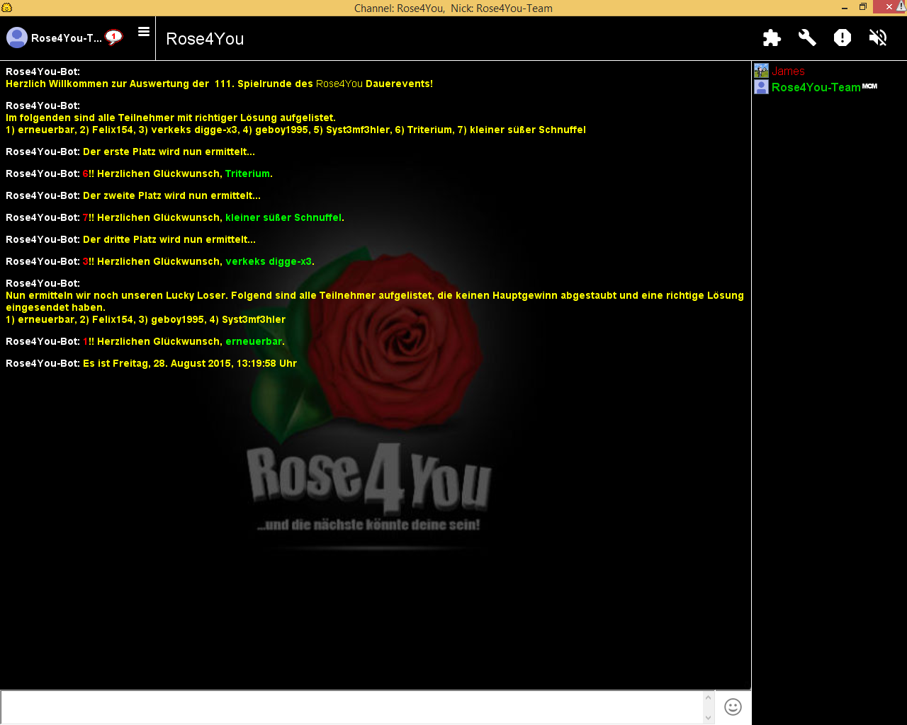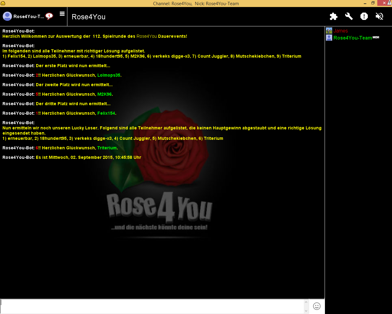 Die Aufgabe #112 lief vom 23.08.2015 - 11:16:42 Uhr bis zum 30.08.2015 - 00:00:00 Uhr und hatte 9 Einsendungen.