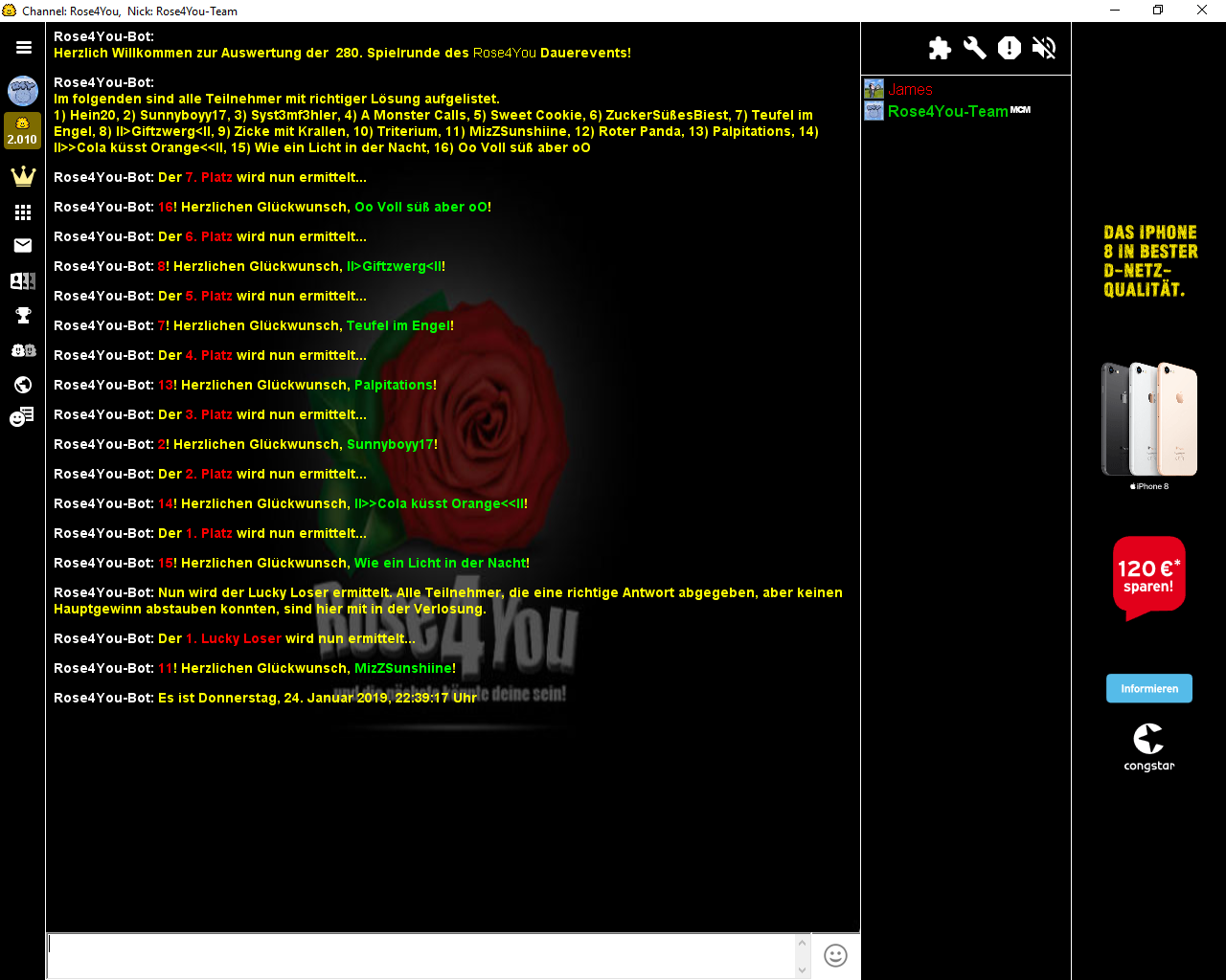 Die Aufgabe #281 lief vom 20.01.2019 - 21:17:29 Uhr bis zum 27.01.2019 - 00:00:00 Uhr und hatte 15 Einsendungen.