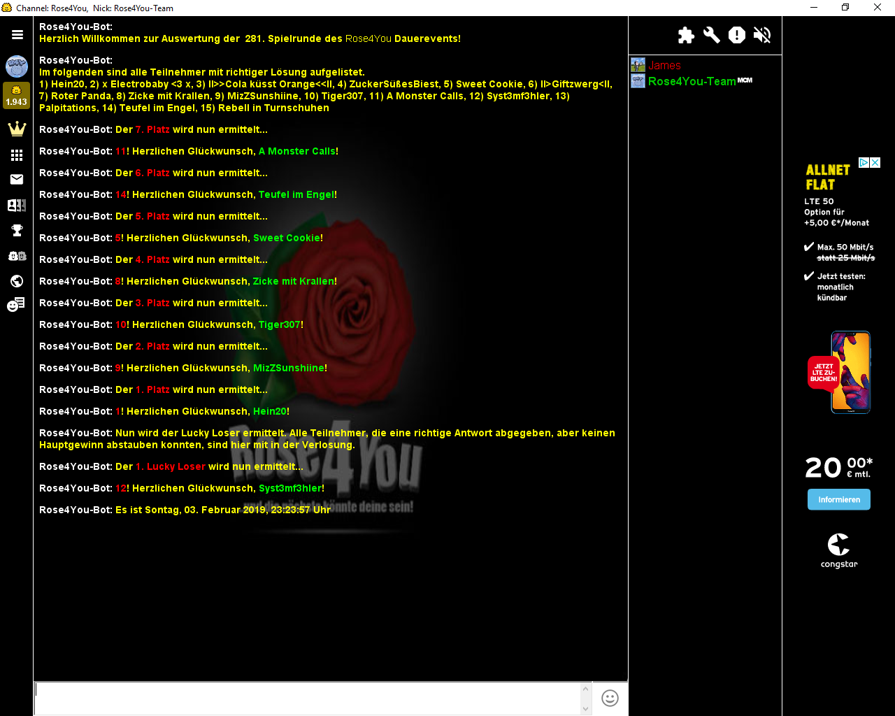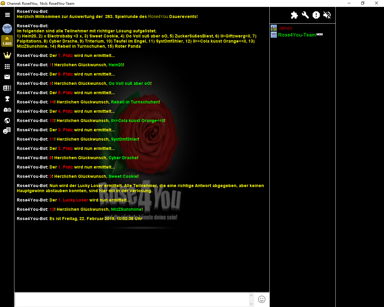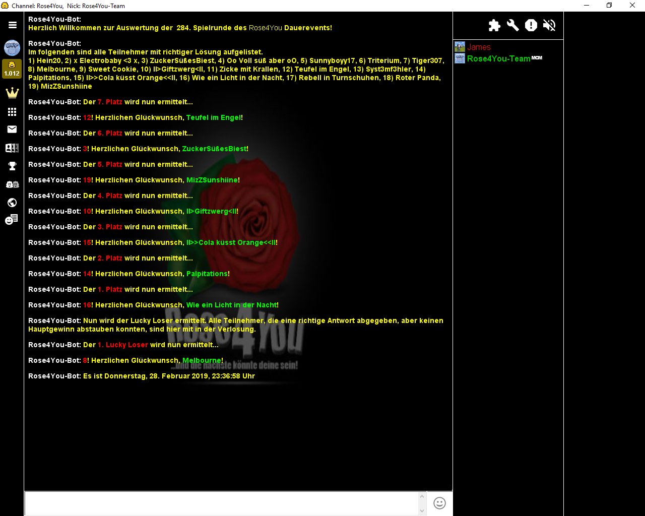 Die Aufgabe #284 lief vom 17.02.2019 - 20:41:52 Uhr bis zum 24.02.2019 - 00:00:00 Uhr und hatte 19 Einsendungen.
