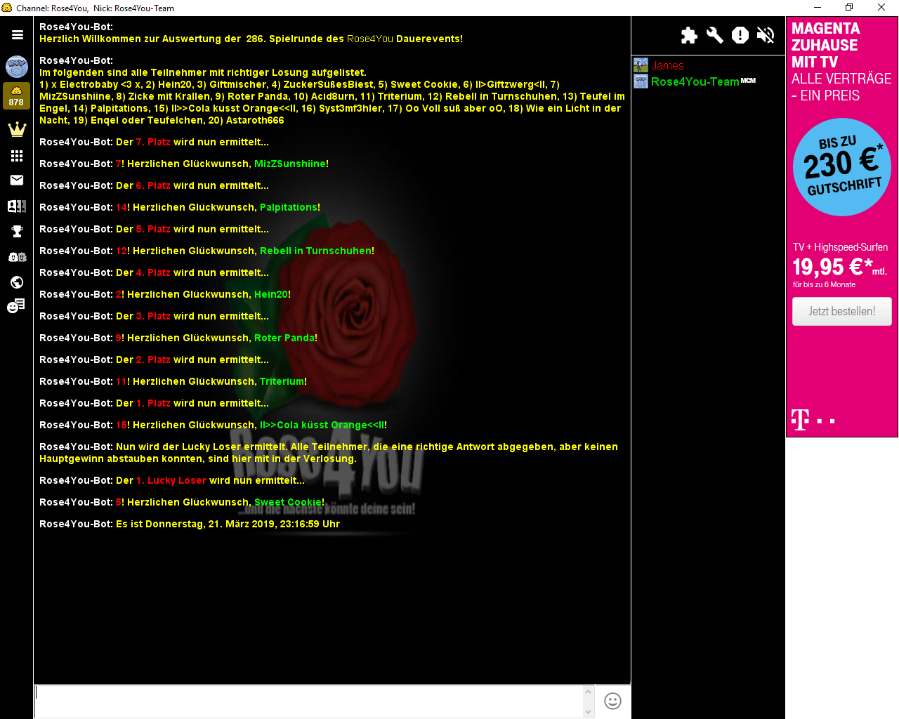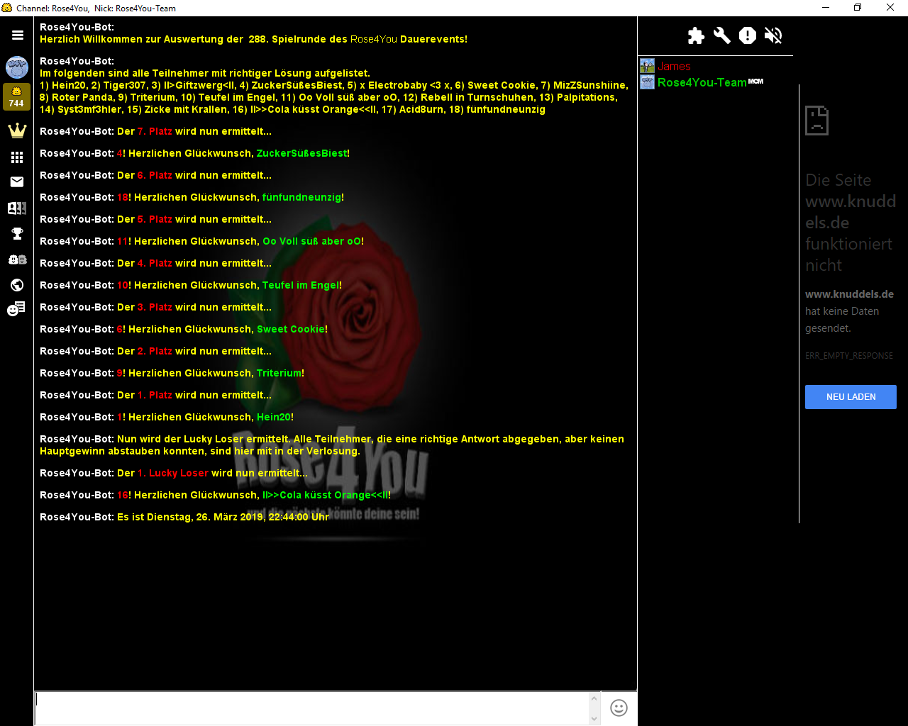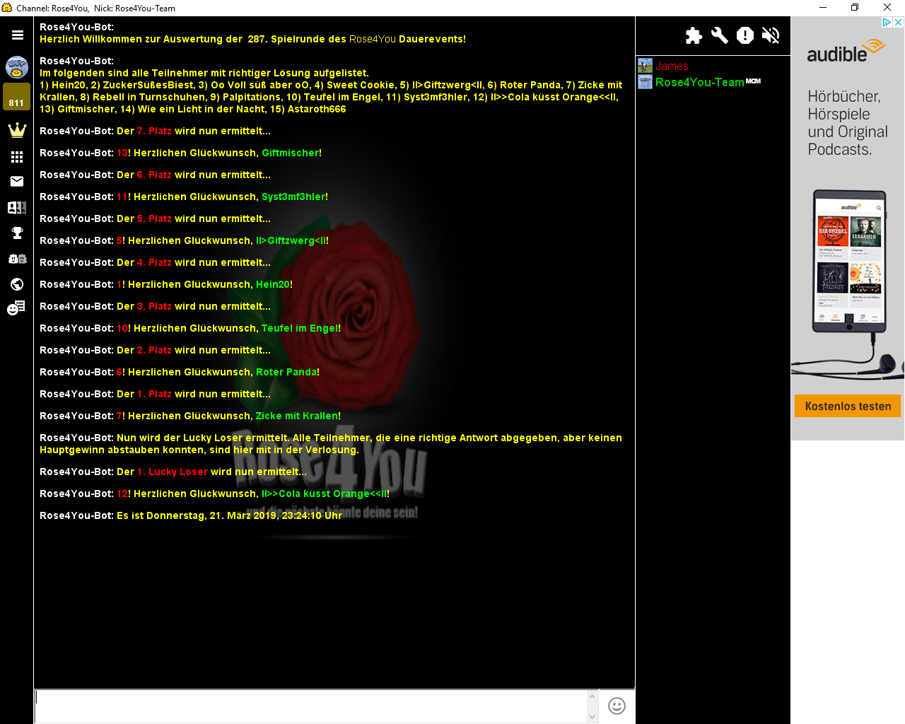 Die Aufgabe #289 lief vom 24.03.2019 - 22:44:56 Uhr bis zum 31.03.2019 - 00:00:00 Uhr und hatte 18 Einsendungen.