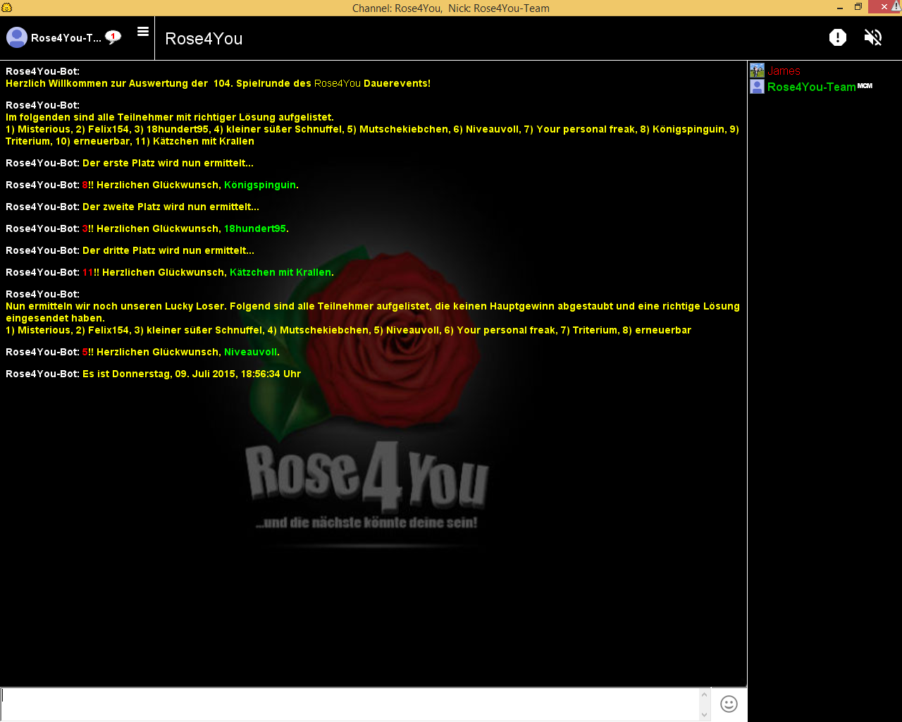Die Aufgabe #104 lief vom 28.06.2015 - 00:25:17 Uhr bis zum 05.07.2015 - 00:00:00 Uhr und hatte 11 Einsendungen.