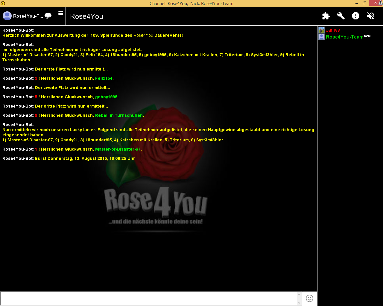Die Aufgabe #109 lief vom 03.08.2015 - 00:17:13 Uhr bis zum 09.08.2015 - 00:00:00 Uhr und hatte 9 Einsendungen.