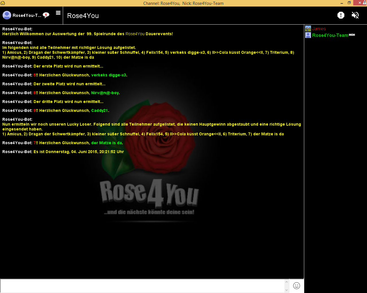 Die Aufgabe #99 lief vom 24.05.2015 - 22:51:17 Uhr bis zum 31.05.2015 - 00:00:00 Uhr und hatte 10 Einsendungen.
