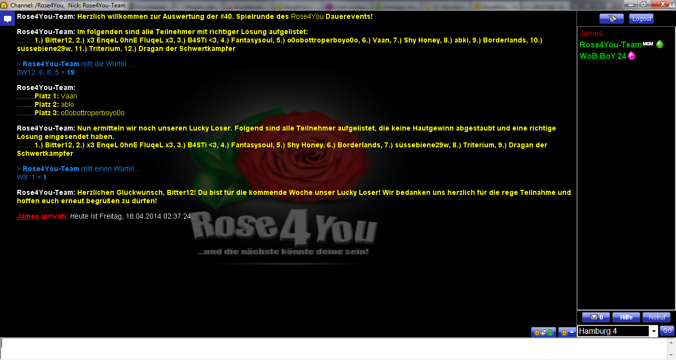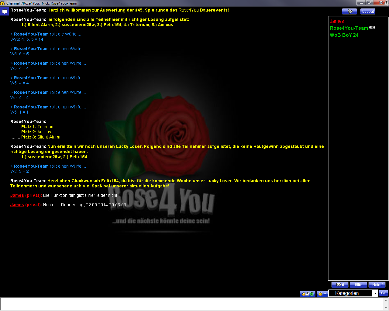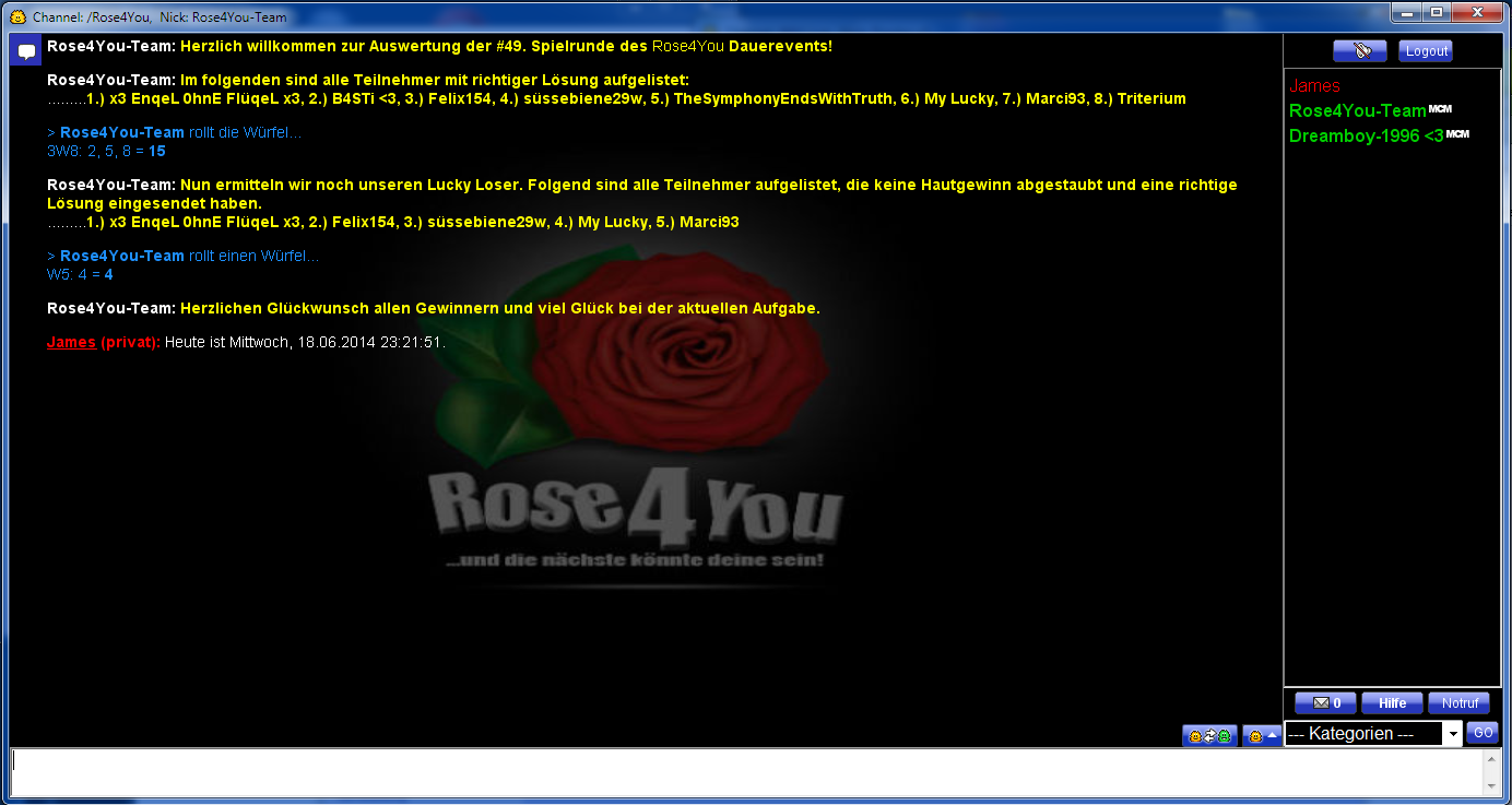 Hinweis: Sofern durch die Aufgabe selbst nicht ohnehin schon unmöglich, so ist es verboten, die Aufgabe quasi durch sich selbst zu lösen - beispielweise wie oben erwähnt mit der Rose, ist es verboten, sich dafür selbst eine Rose zu senden und diese dann abzuscreenen. [mehr]