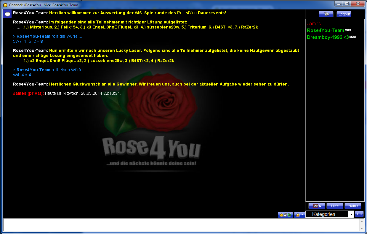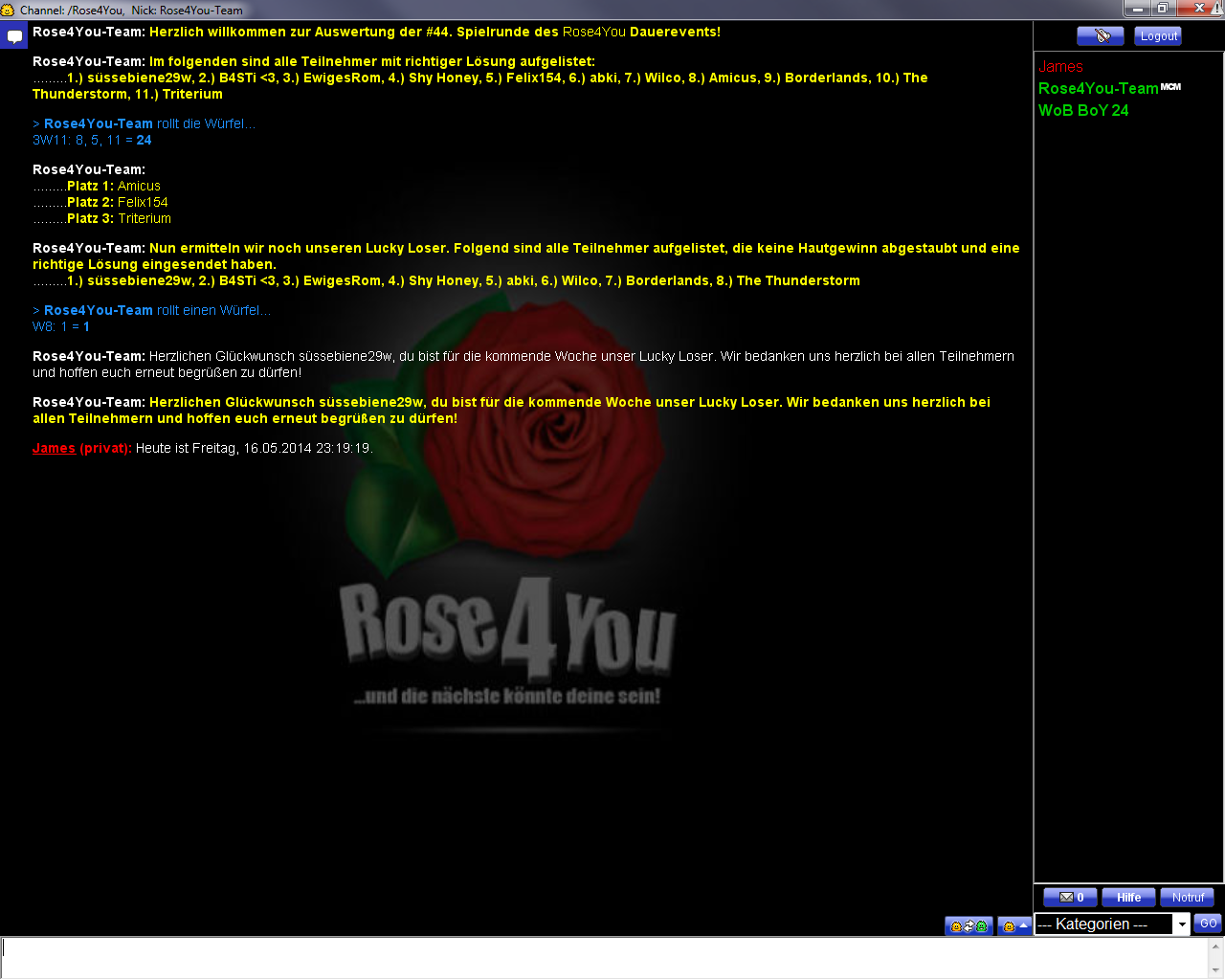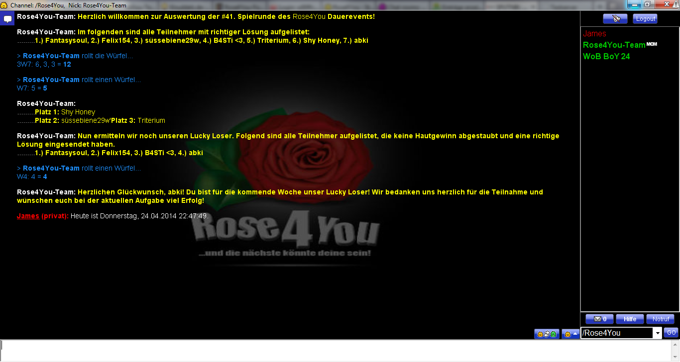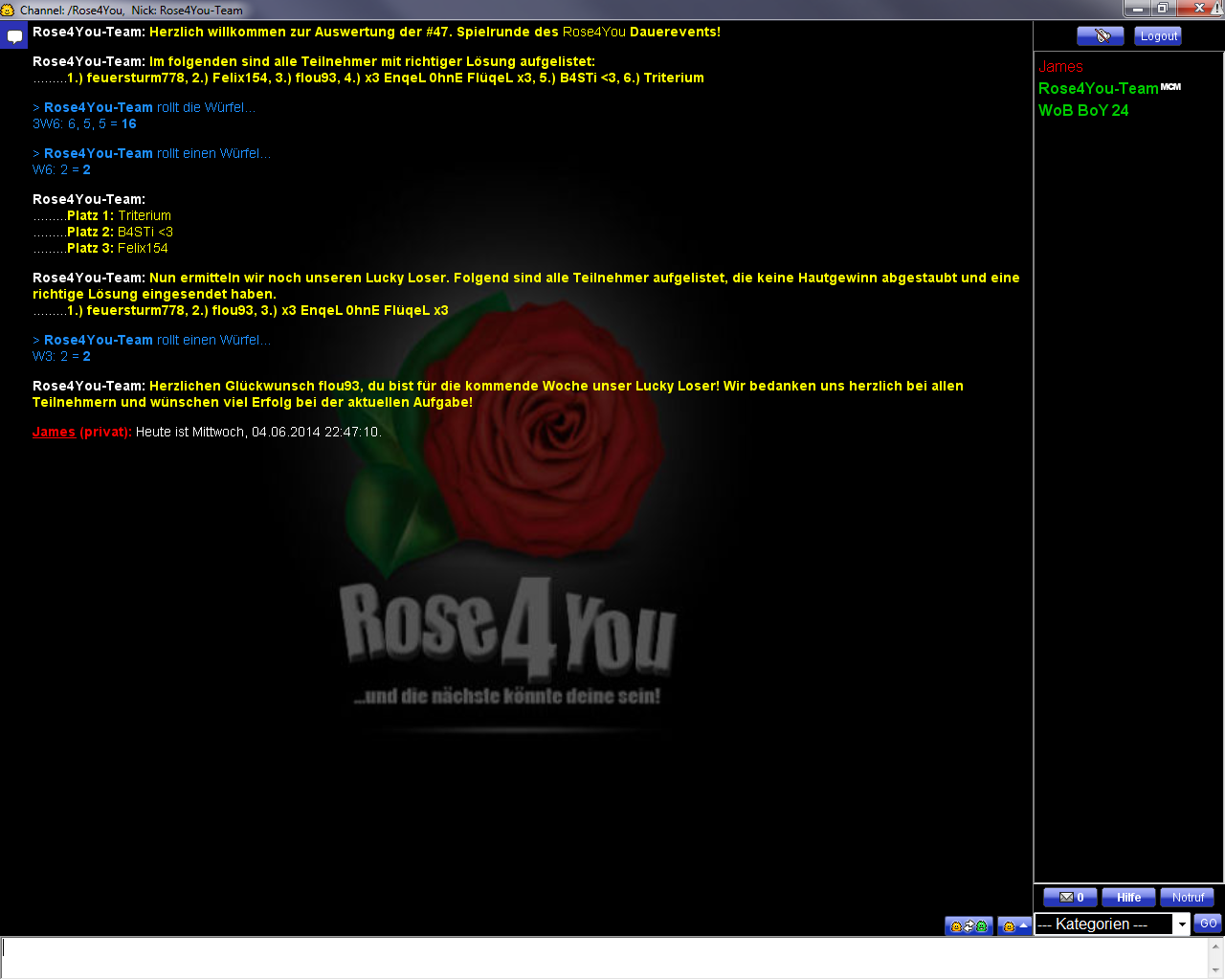 Hinweis: Sofern durch die Aufgabe selbst nicht ohnehin schon unmöglich, so ist es verboten, die Aufgabe quasi durch sich selbst zu lösen - beispielweise wie oben erwähnt mit der Rose, ist es verboten, sich dafür selbst eine Rose zu senden und diese dann abzuscreenen. [mehr]