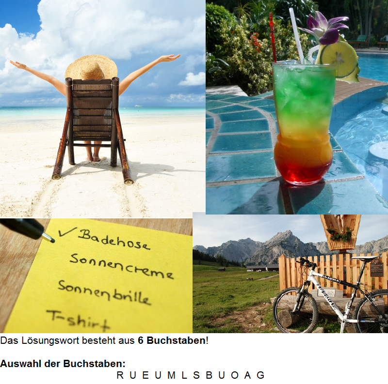 Bei dieser Aufgabenart gibt es ein Bild, welches vier Teilbilder enthält. Anhand dieser vier Bilder musst du einen Sammelbegriff, welcher sich in allen Bildern widerspiegelt erraten. Damit das ganze lösbar ist, wird die Anzahl der Buchstaben sowie eine Auswahl an Buchstaben des Lösungswortes angezeigt. Beachte dass in der Buchstabenauswahl alle Buchstaben für das gesuchte Wort enthalten sind und das Lösungswort daraus gebildet werden muss. Es müssen nicht alle Buchstaben verwendet werden!