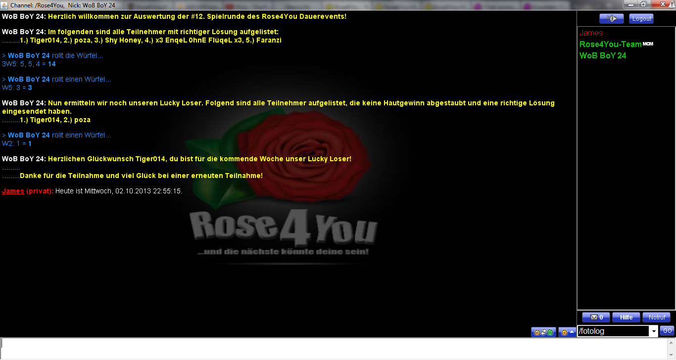 Die Aufgabe #12 lief vom 22.09.2013 - 00:04:28 Uhr bis zum 29.09.2013 - 00:00:00 Uhr und hatte 5 Einsendungen.