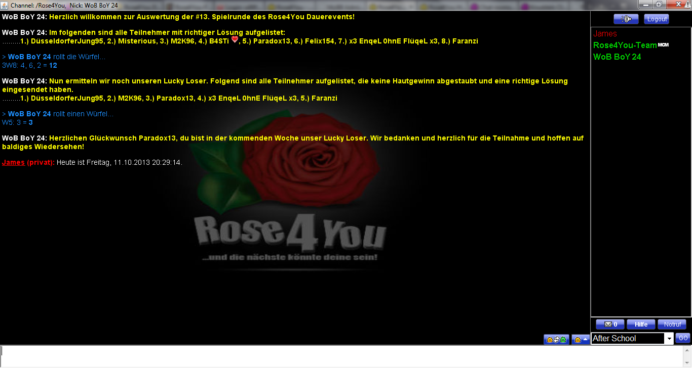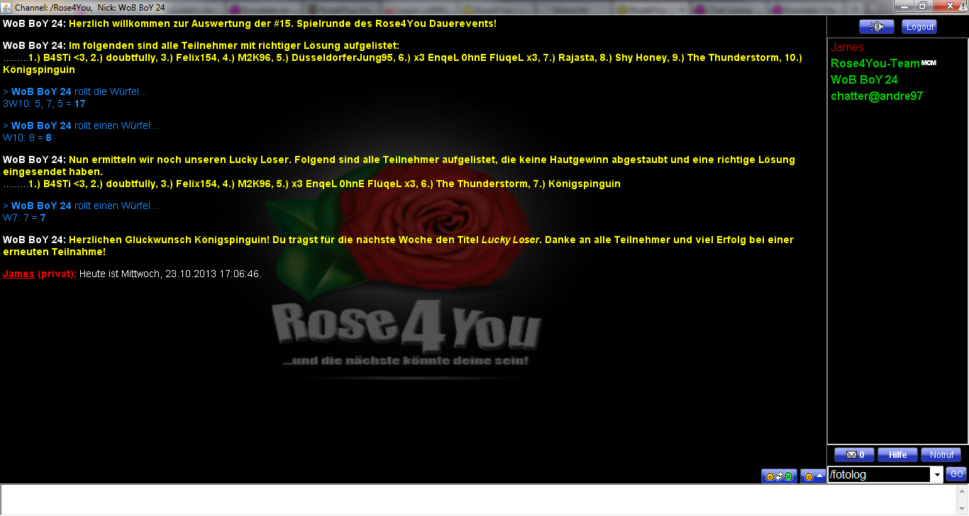 Die Aufgabe #17 lief vom 27.10.2013 - 00:17:09 Uhr bis zum 03.11.2013 - 00:00:00 Uhr und hatte 14 Einsendungen.
