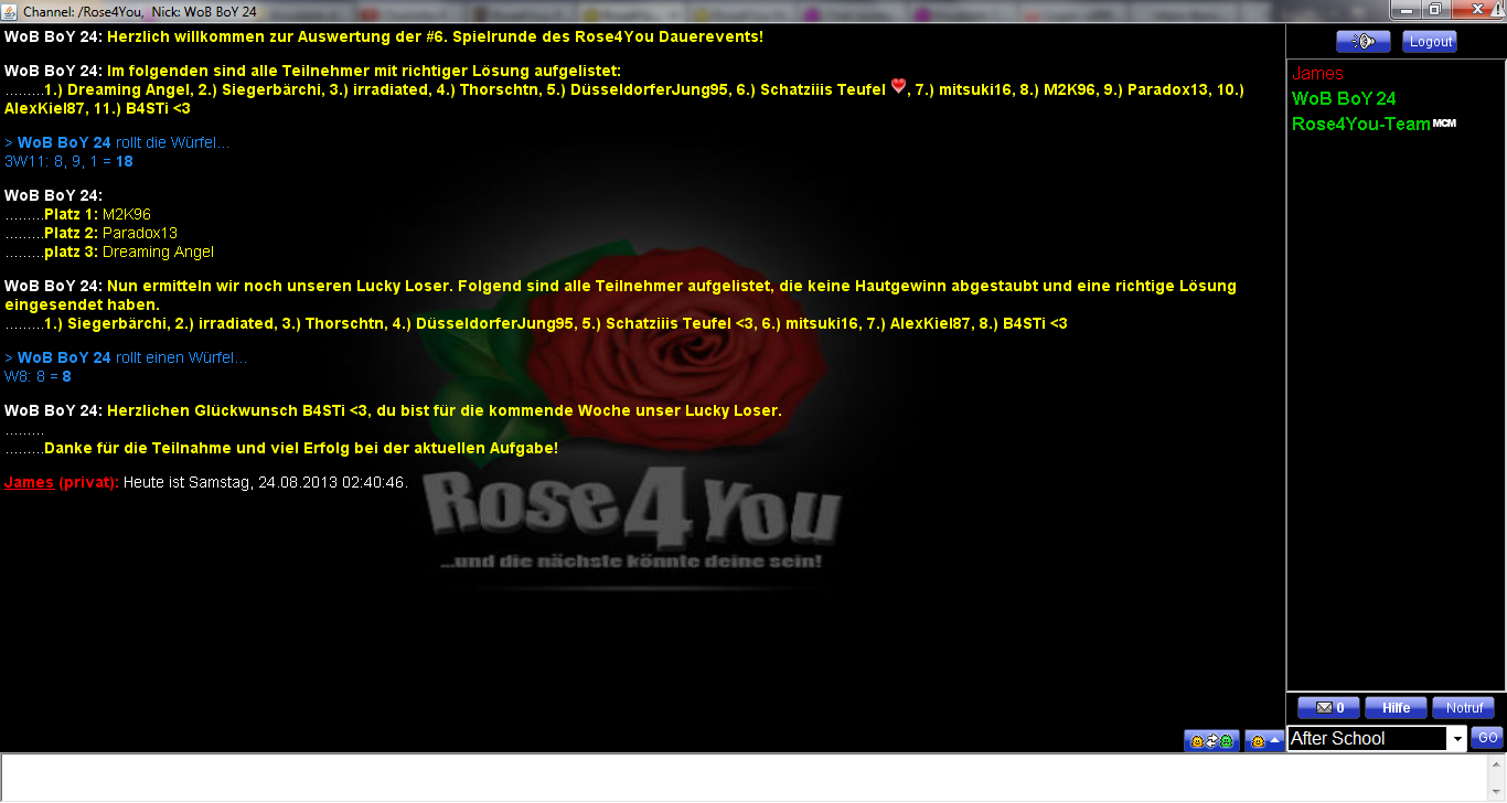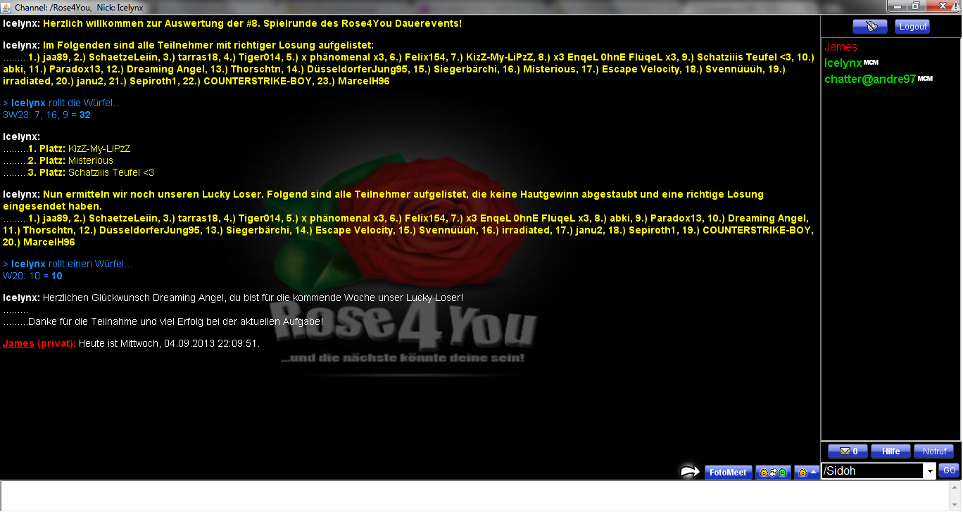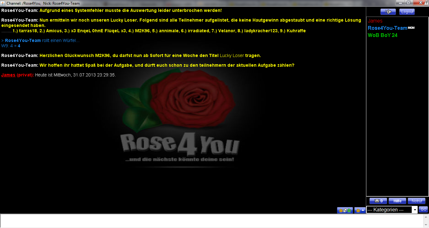 Hinweis: Sofern durch die Aufgabe selbst nicht ohnehin schon unmöglich, so ist es verboten, die Aufgabe quasi durch sich selbst zu lösen - beispielweise wie oben erwähnt mit der Rose, ist es verboten, sich dafür selbst eine Rose zu senden und diese dann abzuscreenen. [mehr]