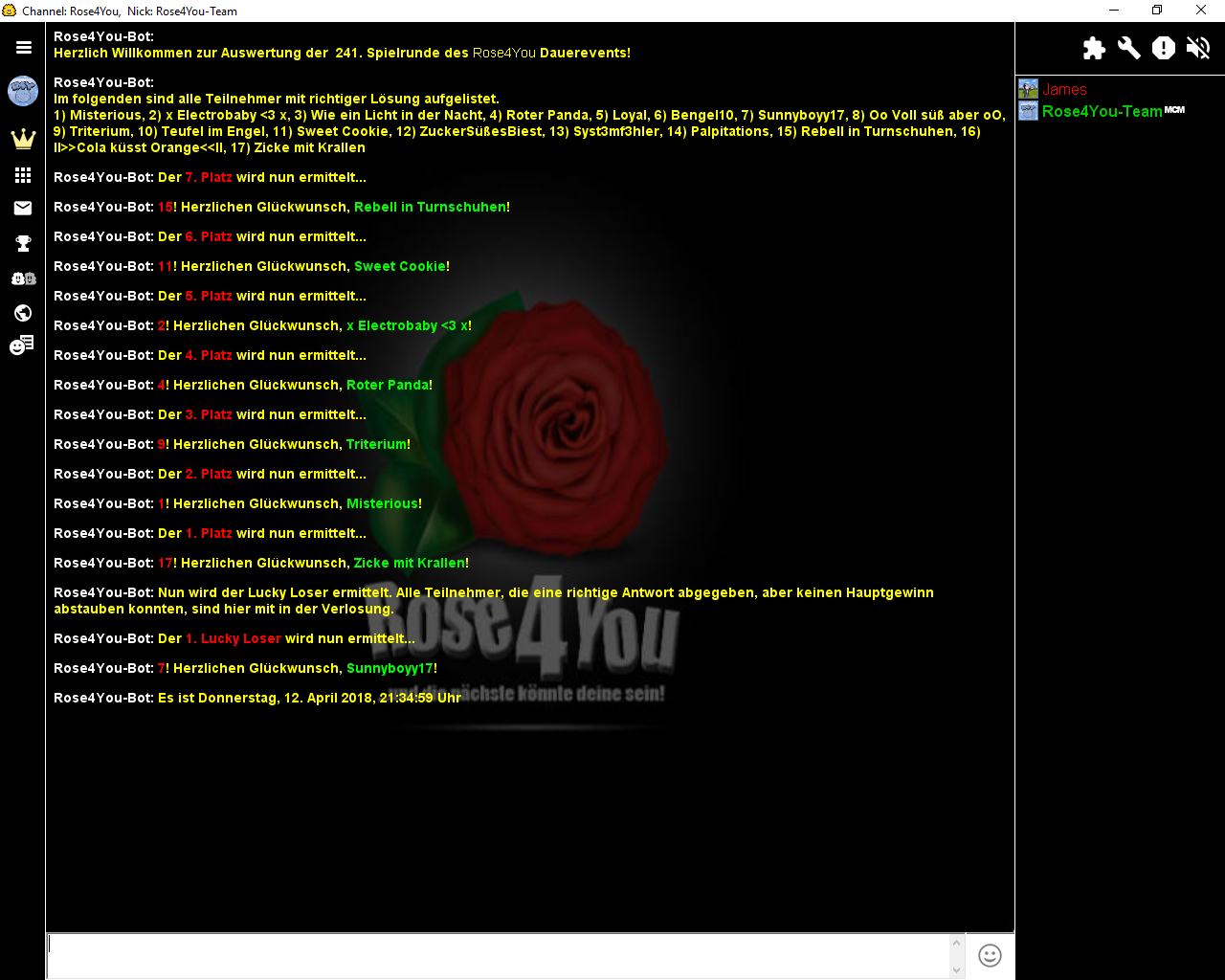 Die Aufgabe #241 lief vom 02.04.2018 - 20:15:44 Uhr bis zum 08.04.2018 - 00:00:00 Uhr und hatte 17 Einsendungen.